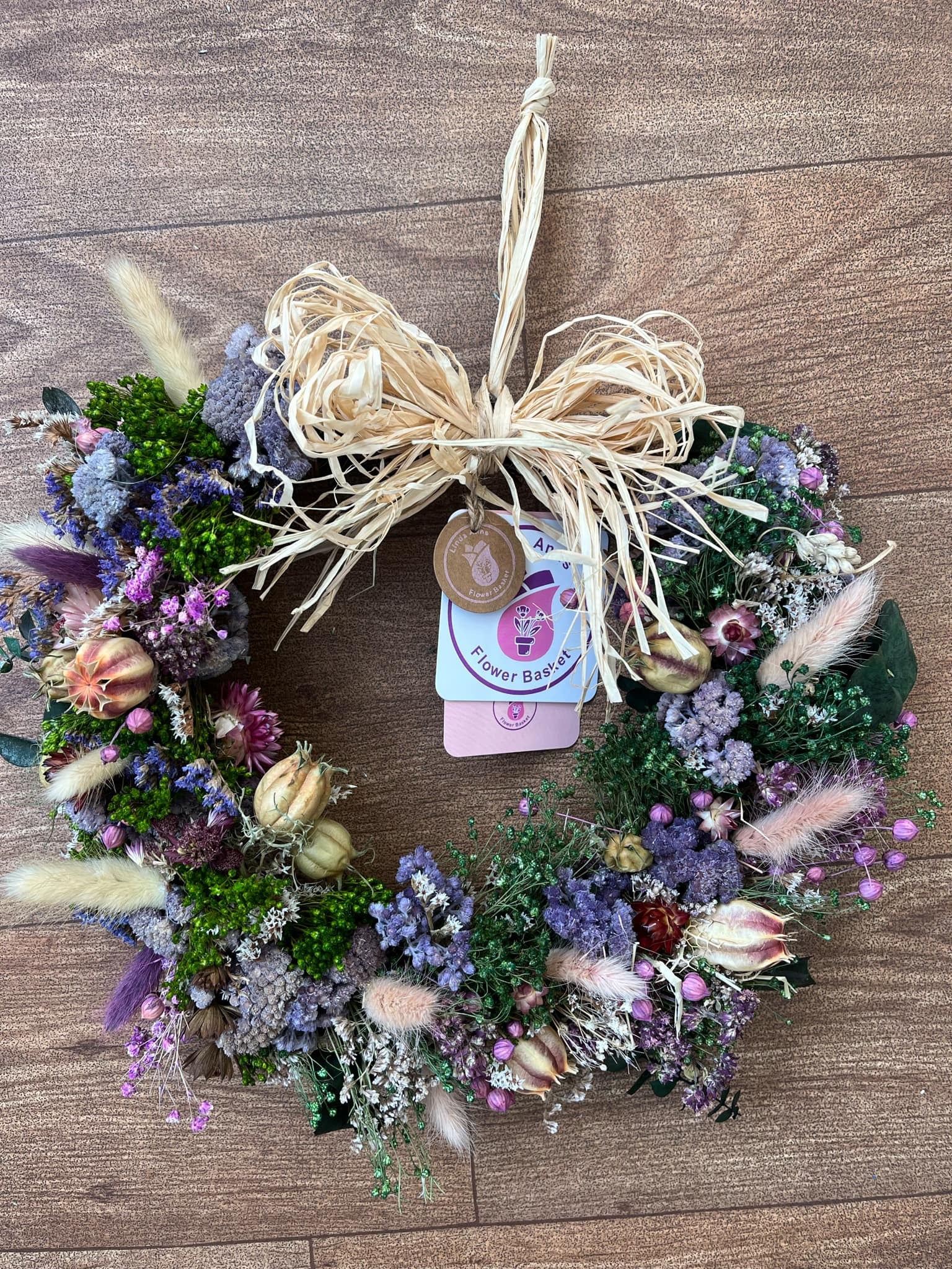 A wreath of approximately 12cm constructed using a bouquet of dried flowers, including Nigella seed heads, Statice, Helichrysum, Bunny tails. Green Broom and many others, tied with a raffia bow